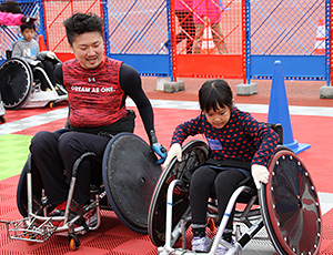 ウィルチェアーラグビーの体験では、共にリオパラリンピックの日本代表選手として銅メダルに輝いた今井友明さんと池崎大輔さんの2人が指導。実戦で使う競技用車椅子に乗り、まず今井さんに操作を教わる。その後、本当の試合のように池崎さんのタックルを受ける。車椅子同士でぶつかり合うのだ。体験指導を終えた女の子は、「車椅子は重くはないけれど、コーナーを曲がるのが難しかった。ぶつかったときは音が大きくてむっちゃびっくりしました」と初めての競技に強い印象を受けた様子。