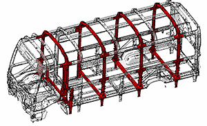 課題解決に向け、新型コースターでは「パッシブセーフティの強化を重視」(山川雅弘主査)した。先代との大きな違いは「環状骨格」の採用だ。図のように四面の骨格をつないで一体化することで、ボディ剛性を向上させた。昨年12月に行われた発表会では、検証映像を披露。映像ではボディが横転しサイドが地面に叩きつけられても変形が少なく、室内側の生存空間が確保されていた。ロールオーバー(横転)の欧州安全基準を上回る性能という。
