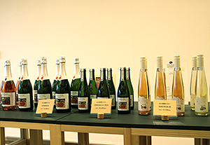 ワイナリー内のショップで今販売しているお酒は、地元郡山などで獲れたリンゴのシードルと、桃、梨のリキュール、そして会津産のマスカット.べーリーAのロゼだ。もちろん醸造はすべて逢瀬ワイナリー。ロゼは甘すぎず、バランスのよいやさしい味わい。シードルは「他の産地と飲み比べても、やっぱり福島の味。飲みやすく、これがおいしいなと思う」と郡山市園芸畜産振興課の箭内勝則課長補佐。郡山産の幸水と豊水が原料という珍しい和梨のリキュールは、ロックで味わうのがお勧めだそうだ。