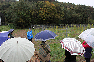 果実圧搾の機器や貯蔵タンクがある施設内部は普段は関係者以外立ち入り禁止。佐々木さんの説明に、参加者から「発酵期間は」「ロゼの場合は」と、次々に質問が飛ぶ。さらに、今回の見学コースにはブドウ畑も入っている。今年の春、隣接地にできた約15アールの実証圃場だ。「1年目の若木なので収穫は再来年から。落葉したら剪定し、新しい枝を伸ばしていきます」――。果樹の実物を眼前にしての解説に、見学者たちの期待も大いに高まったようだ。