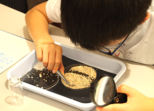 前方に置かれた水槽の中には、色も形もとりどりの小さなサンゴが輝いている。教室が始まる前から、子どもたちは興味津々だ。授業はサンゴについての話を軸に、水槽のサンゴがプランクトンを食べる様子を電子顕微鏡で観察したり、サンゴ礁の砂浜の砂を虫眼鏡で調べたりと、直接実物にふれあう体験学習。ほとんど初めて観察するサンゴの生態に、子どもたちのまなざしは真剣そのものだ。講師の先生たちはサンゴについてわかりやすく解説しながら、さまざまな問いを投げかける。