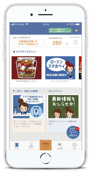 機能でも先頭を走るローソンのアプリは、18年11月末時点でダウンロード数480万。月に一度は必ずアプリを開く月間アクティブユーザーは140万人を数える。トップ画面には連携したPontaポイントかdポイントのポイント数が表示され、店舗検索で近くの店を探すのも簡単だ。