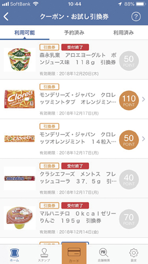 お試し引換券の画面。すでに売り切れで「受付終了」の表示が出ているものも