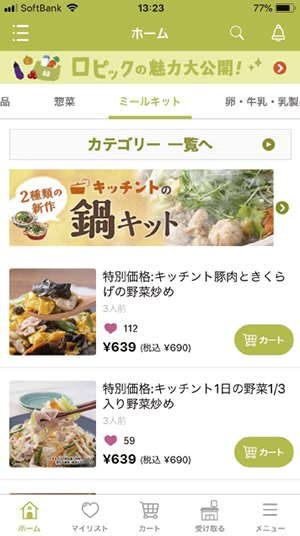 ローソンフレッシュピックのアプリ画面。材料がセットになったミールキットが人気