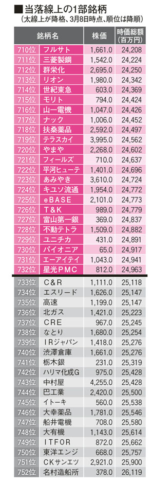 ハードルが250億円だと、3月8日時点の株価で約730社がクリアできない。1部上場の3分の1が「東証2部+JASDAQスタンダード」に移るか、「マザーズ+JASDAQグロース」に移ることになる。降格なら、東証株価指数(TOPIX)に連動して資金を運用する年金や海外投資家などから資金流入が見込めなくなり、空売りには格好の標的。当落線上の銘柄はJリーグの2部入れ替え戦と同じく過熱しそうで、メールはその導火線になった。
