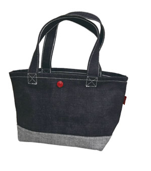 プレゼンするのはエドウインのデニムバッグ。とても丈夫で、「日本製の印」としてつけた赤ボタンがポイント