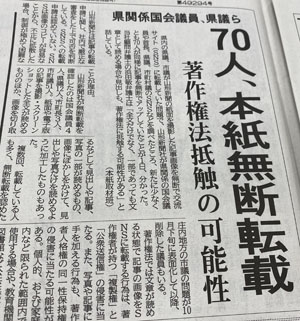 ことの発端は、7月8日朝刊に掲載された1本の記事だった。「本紙記事を無断投稿」との見出しがついた500文字ほどの記事。内容は「関徹県議(共産)が、山形新聞の紙面を撮影した画像を無断で自身のフェイスブックなどに投稿していた。2019年8月以降に約20件。投稿した理由は『自分の県議活動の報告として記事を引用した』」というものだった。