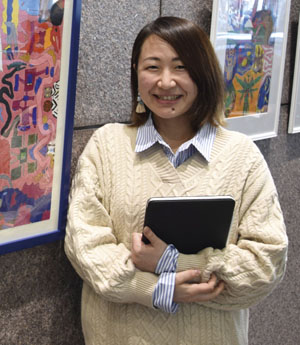 「この展示が皆さんの目に触れ、理解を深めていただくと共に、支援の輪が広がっていくことを願っています」と話すのは、サステナビリティ推進部の小室真由美さん。ロビーに展示された作品は目につきやすく、立ち止まって見てもらえる機会が多い。今後は障害の種類を問わず、作品を入れ替えて展示していく。