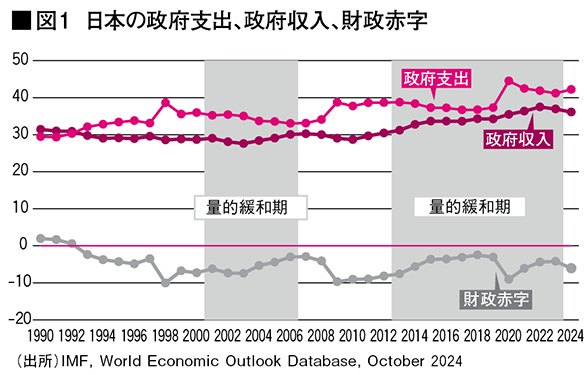 図1は一般政府の政府支出と政府収入と差額、財政収支を見たものである。ここで財務省の用いる一般会計の数字ではなく一般政府の数字を用いるのは、国際比較にはこちらを使用しているからである。(一般会計の数字でも同じような動きをしている)(一般会計の数字は、原田泰『日本人の賃金を上げる唯一の方法』第4章第2節(PHP新書、2024年)参照)