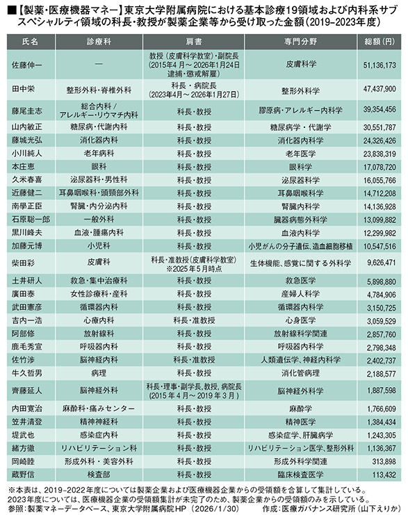 事実、佐藤医師の事例は氷山の一角に過ぎない。東大病院において、製薬企業や医療機器企業から巨額の資金提供を受けている医師は多数存在する(表参照)。